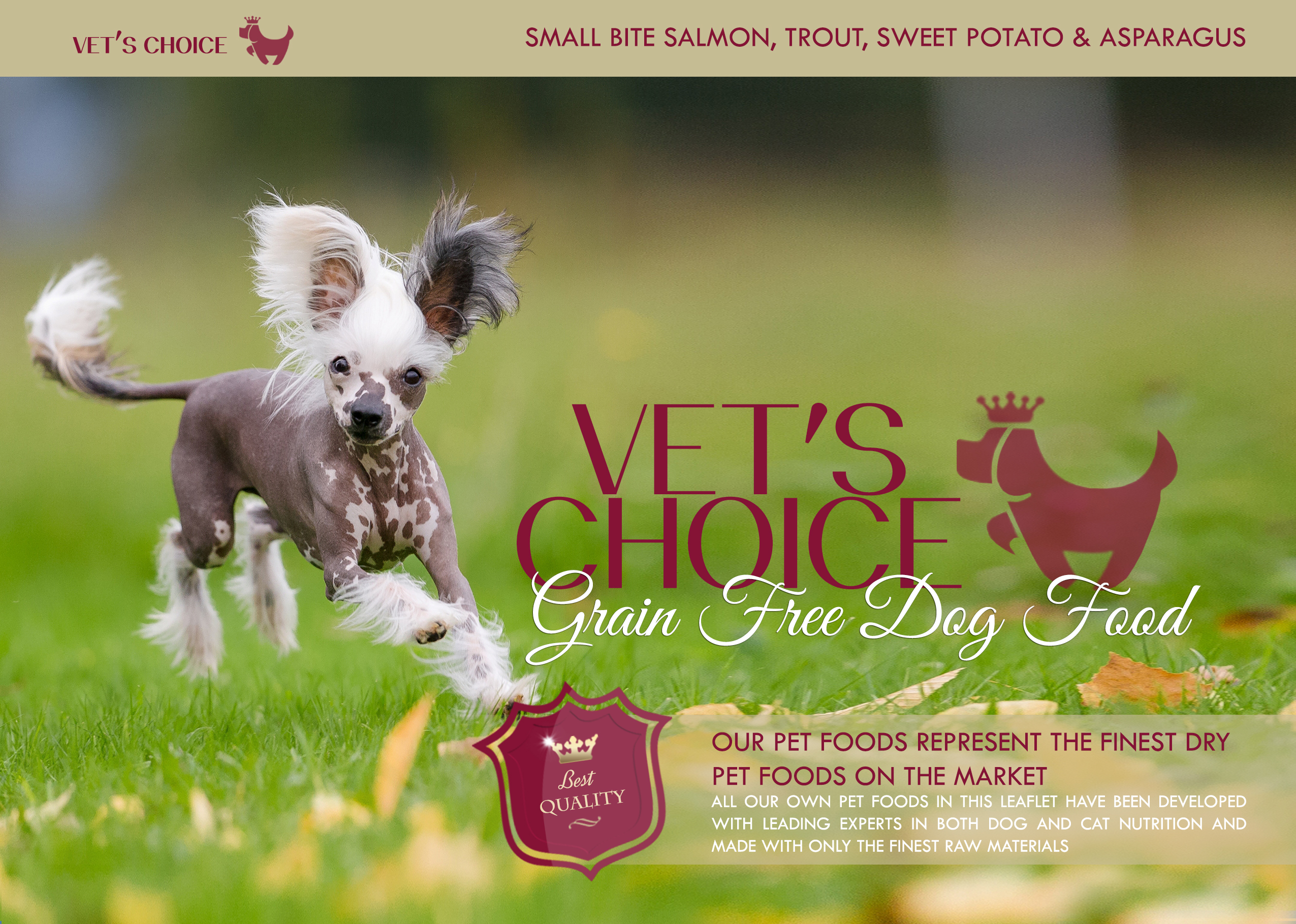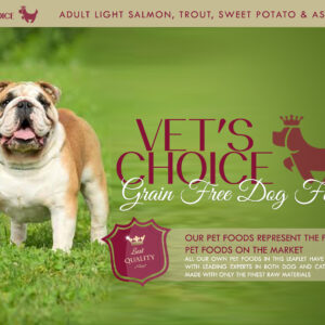 Sestava: losos in postrv 53 % ( vsebuje 27 % sveže pripravljenega lososa & postrvi, 20 % sušenega lososa, 4% lososovega olja in 2 % ribje omake), sladki krompir (22 %), grah, krompir (6 %) , pesina pulpa, laneno seme, vitamini in minerali, zelenjavna omaka, dodatek omega-3, asparagus (7,5g/kg), FOS (92mg/kg), MOS (23mg/kg). Analitske sestavine: surove beljakovine: 27 %, surova olja in maščobe 15 %, surovi pepel 8 %, surova vlakna 4,5 %, omega-6, omega-3, kalcij, fosfor.